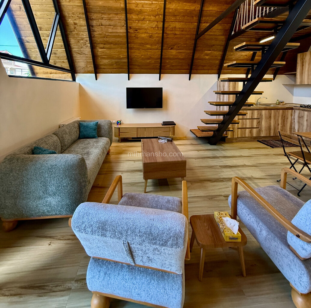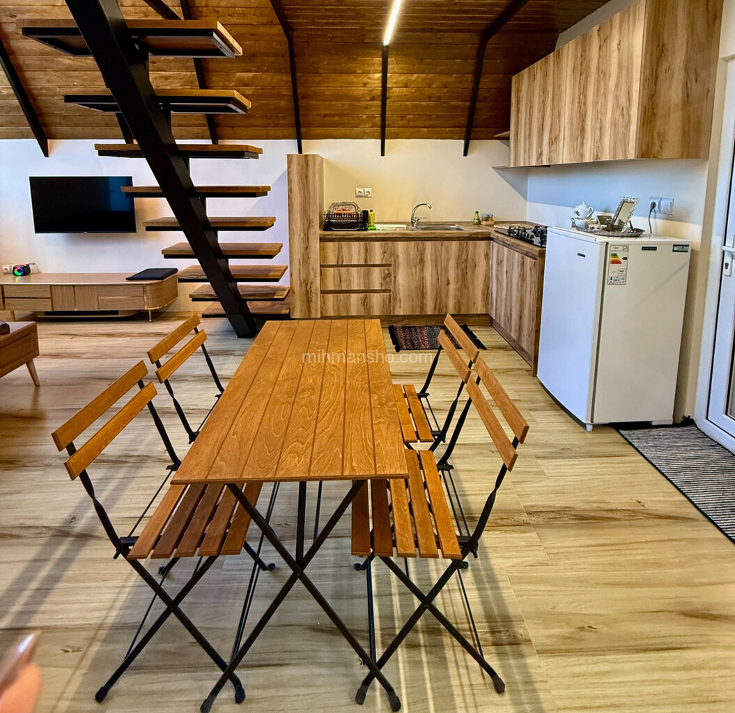 کلبه سوئیسی مبله تک خواب با متراژ 45 متر در زمین 95 متری در رامسر واقع شده است.