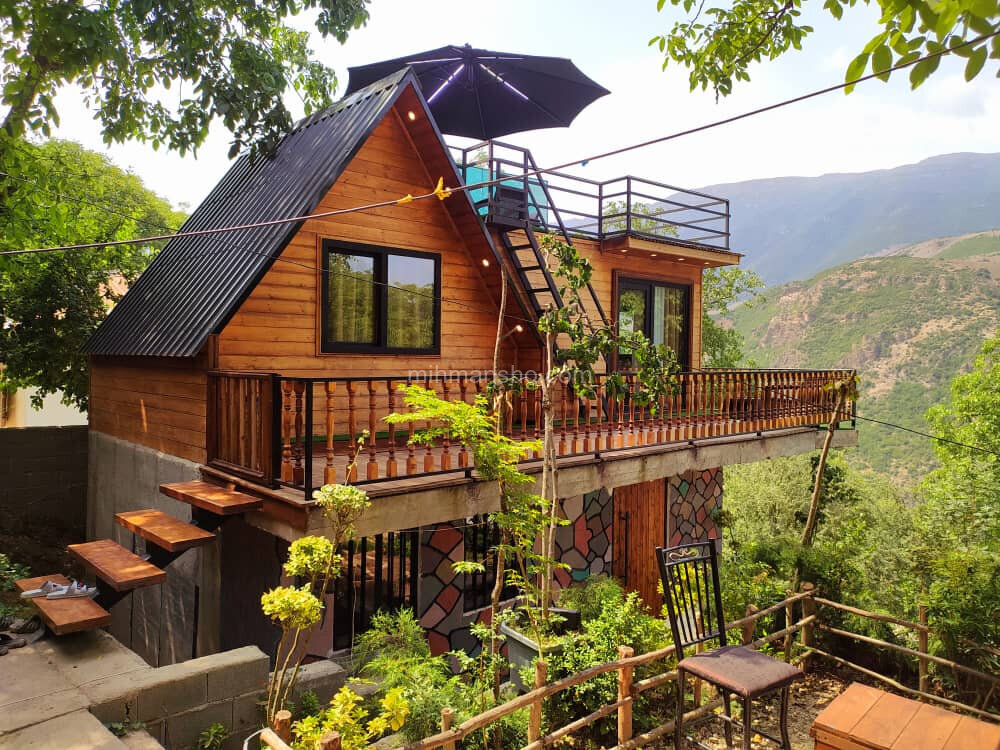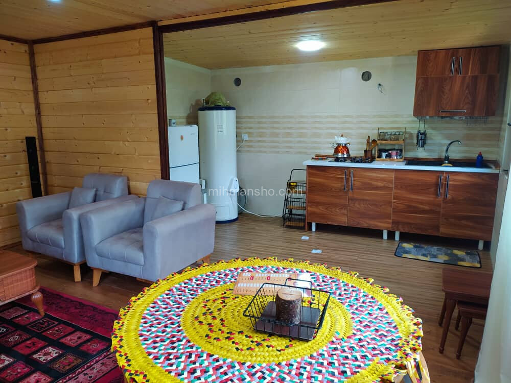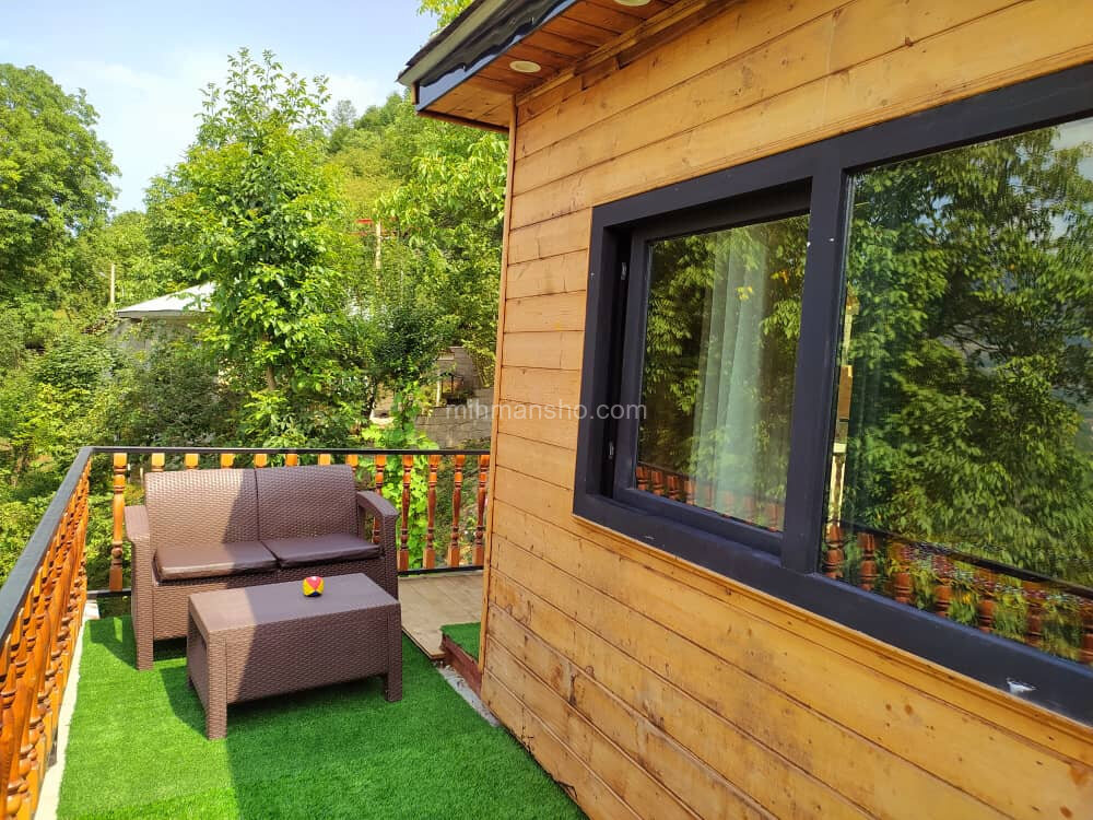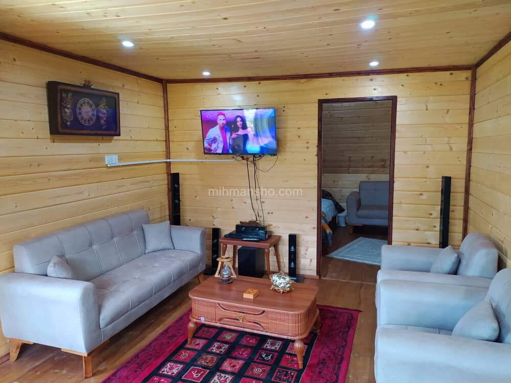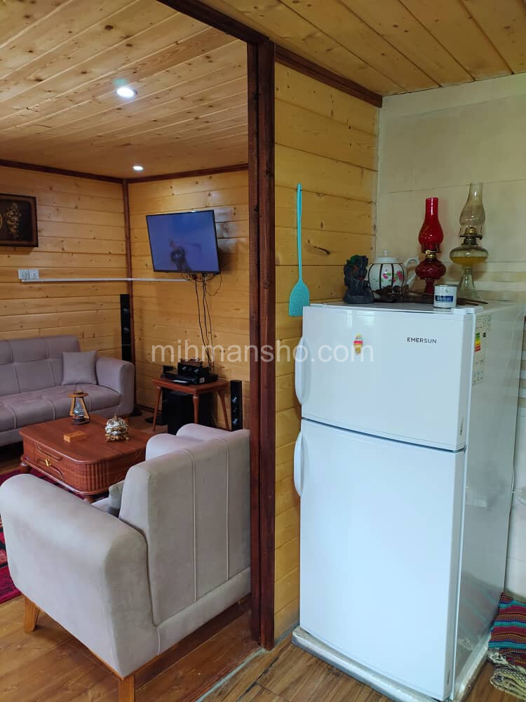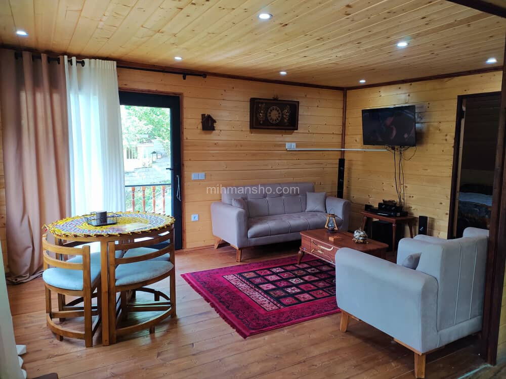کلبه چوبی تکخواب با متراژ 100 متر و دارای تراسی زیبا با چشم انداز به جنگل وکوهستان است که در رامسر واقع شده است.