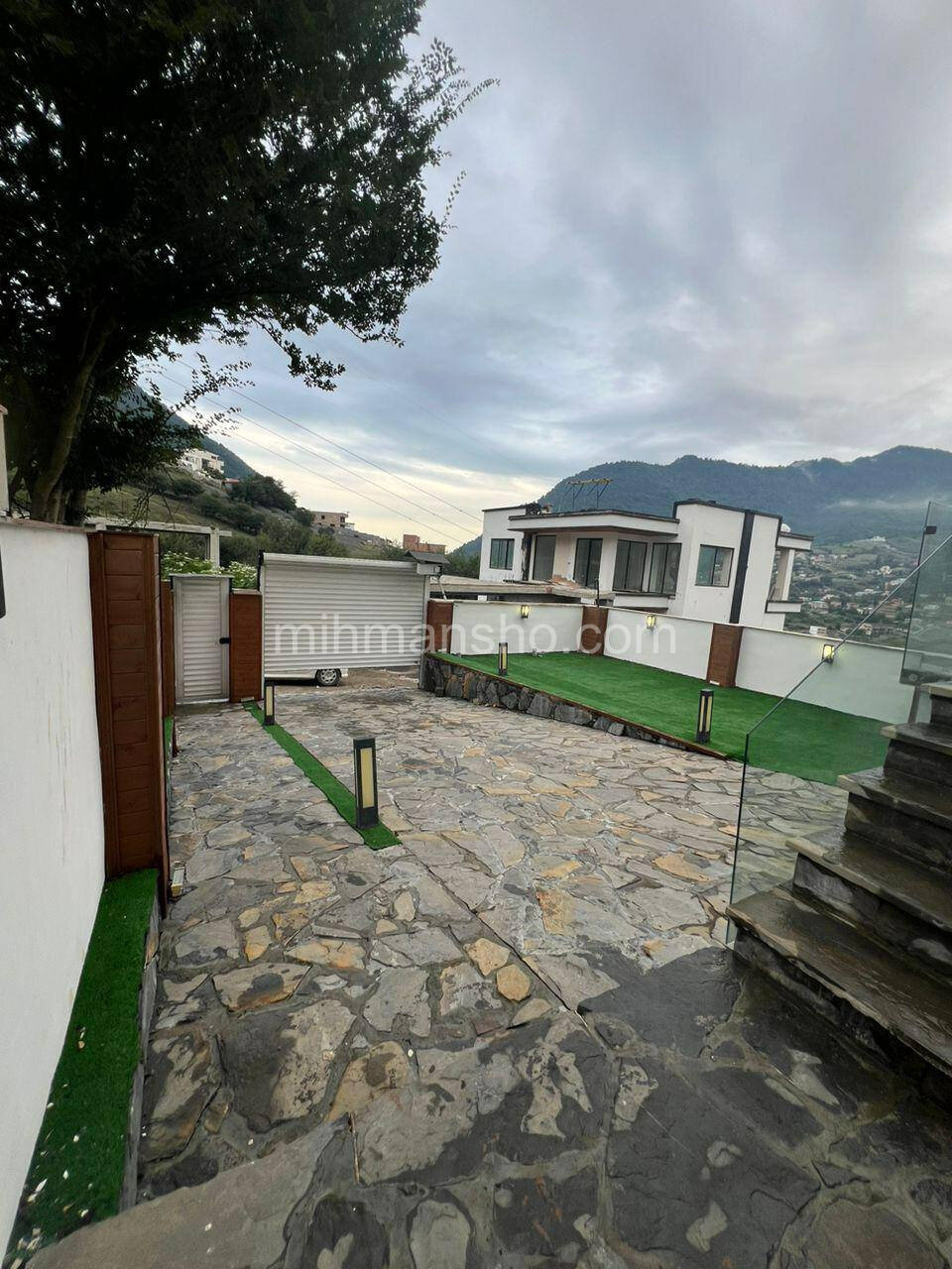 نمای ساختمان از چوب و سیمان سفید و مسیر منتهی به ملک کاملا آسفالت می باشد.